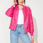 The Ivy Bomber Jacket is a true statement piece. Bold, empowering, and effortlessly chic. Crafted from luxurious textured jacquard, its muted floral design is elevated by it’s striking hot pink hue with metallic accents.