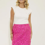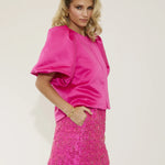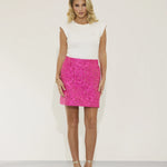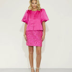 The Faye Skirt is a new addition to the NOMI collection. Tailored to pair beautifully with The Ivy Bomber Jacket, it’s crafted from a hot pink jacquard fabric, subtly interwoven with metallic threads for a touch of refinement.