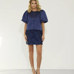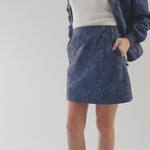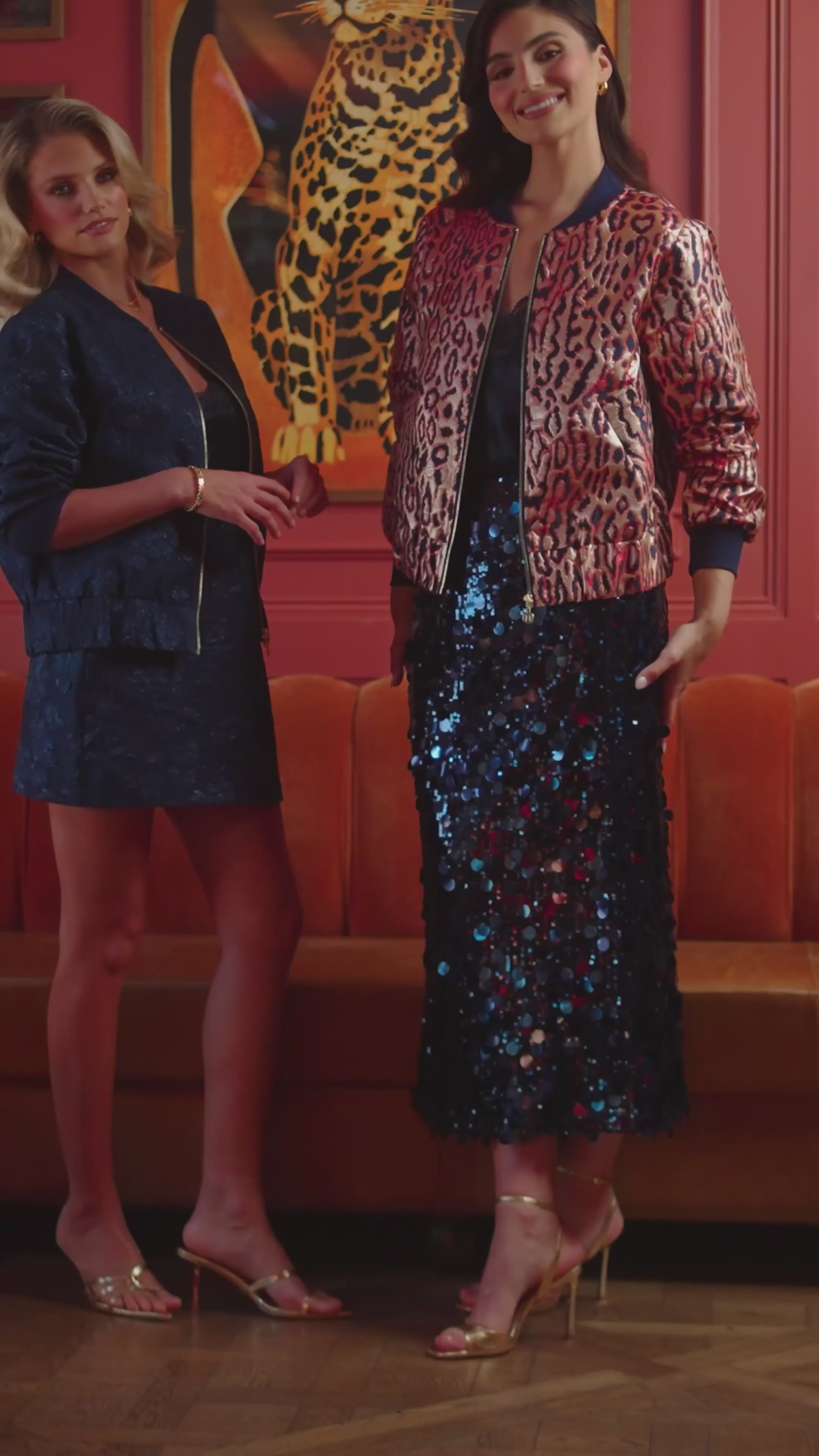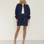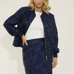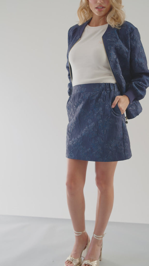 The Remi Skirt brings fresh energy to the NOMI collection. Designed to pair perfectly with The Isla Bomber Jacket, she’s crafted from the same exquisite navy jacquard woven with subtle metallic tones; rich, refined, and endlessly flattering.