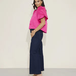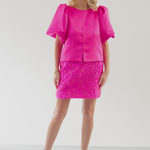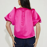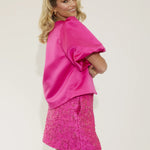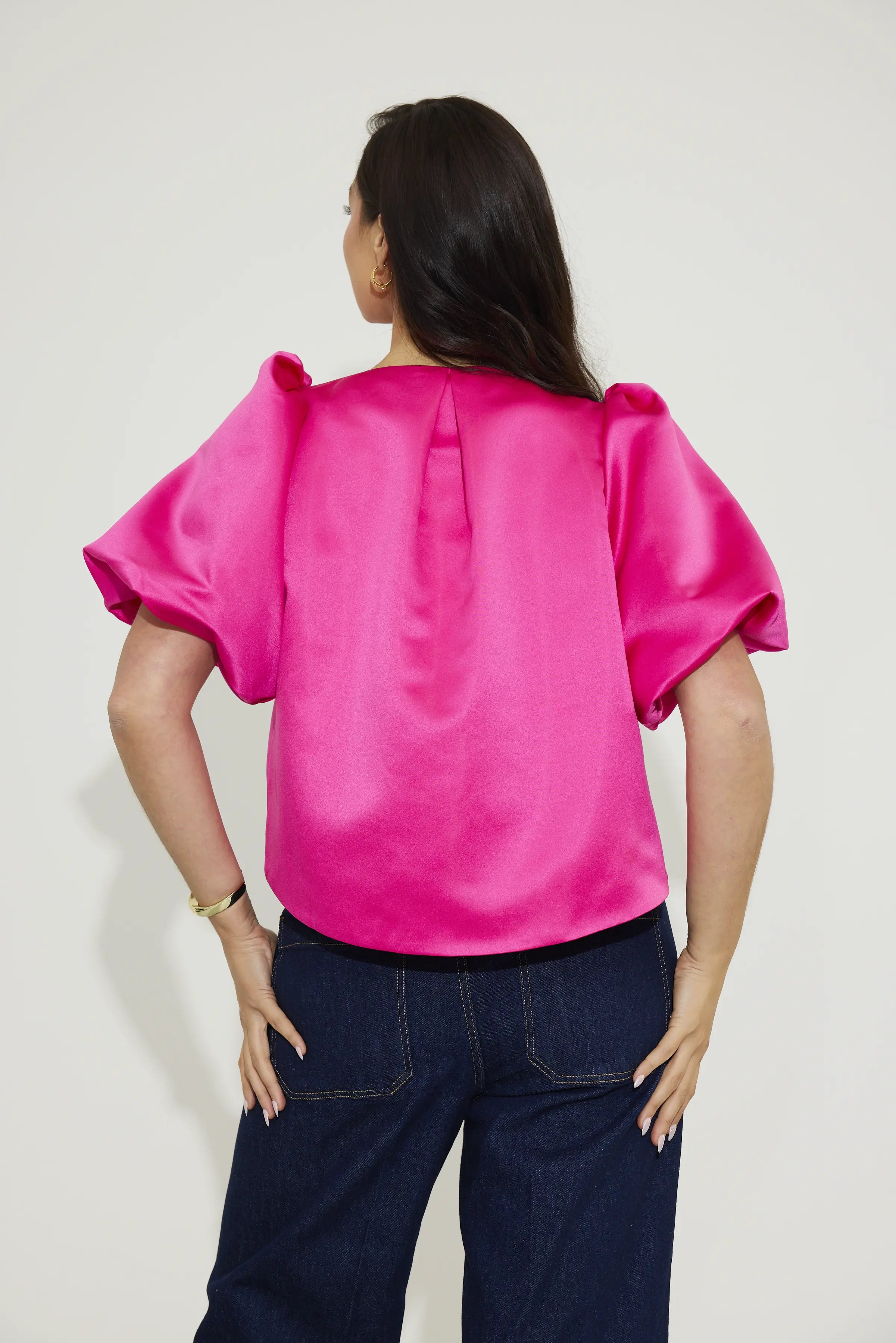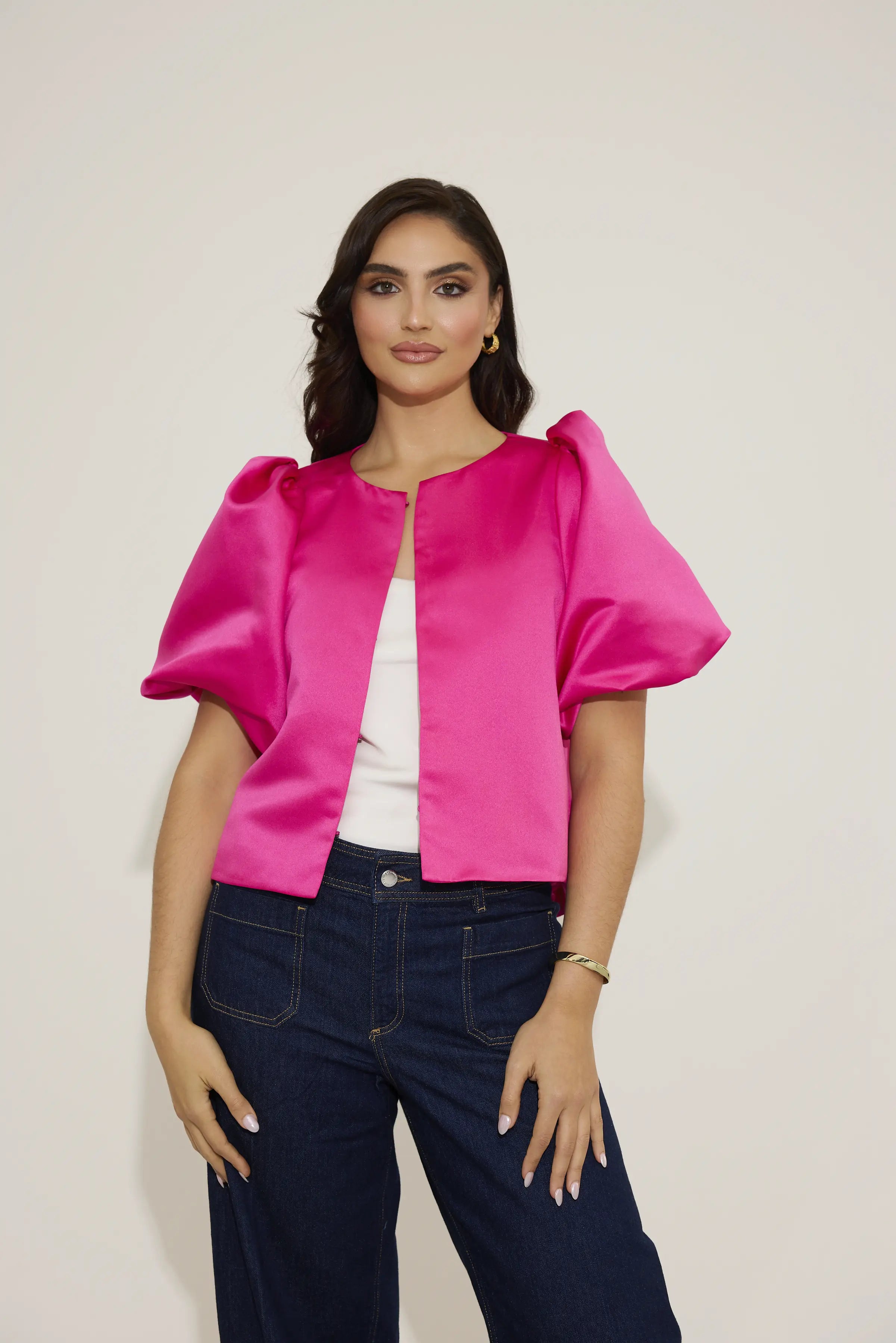 The cut remains true to the classic NOMI design: a wider boat neckline, romantic puff sleeves, and a slightly longer back hem that drapes elegantly. Finished with a hook-and-eye closure for a seamless front and our custom NOMI lining, every detail is considered. Marlow in pink is the definition of modern femininity; strong, confident, and impossible to ignore.