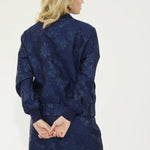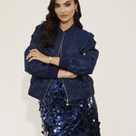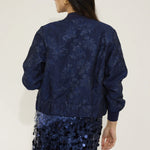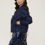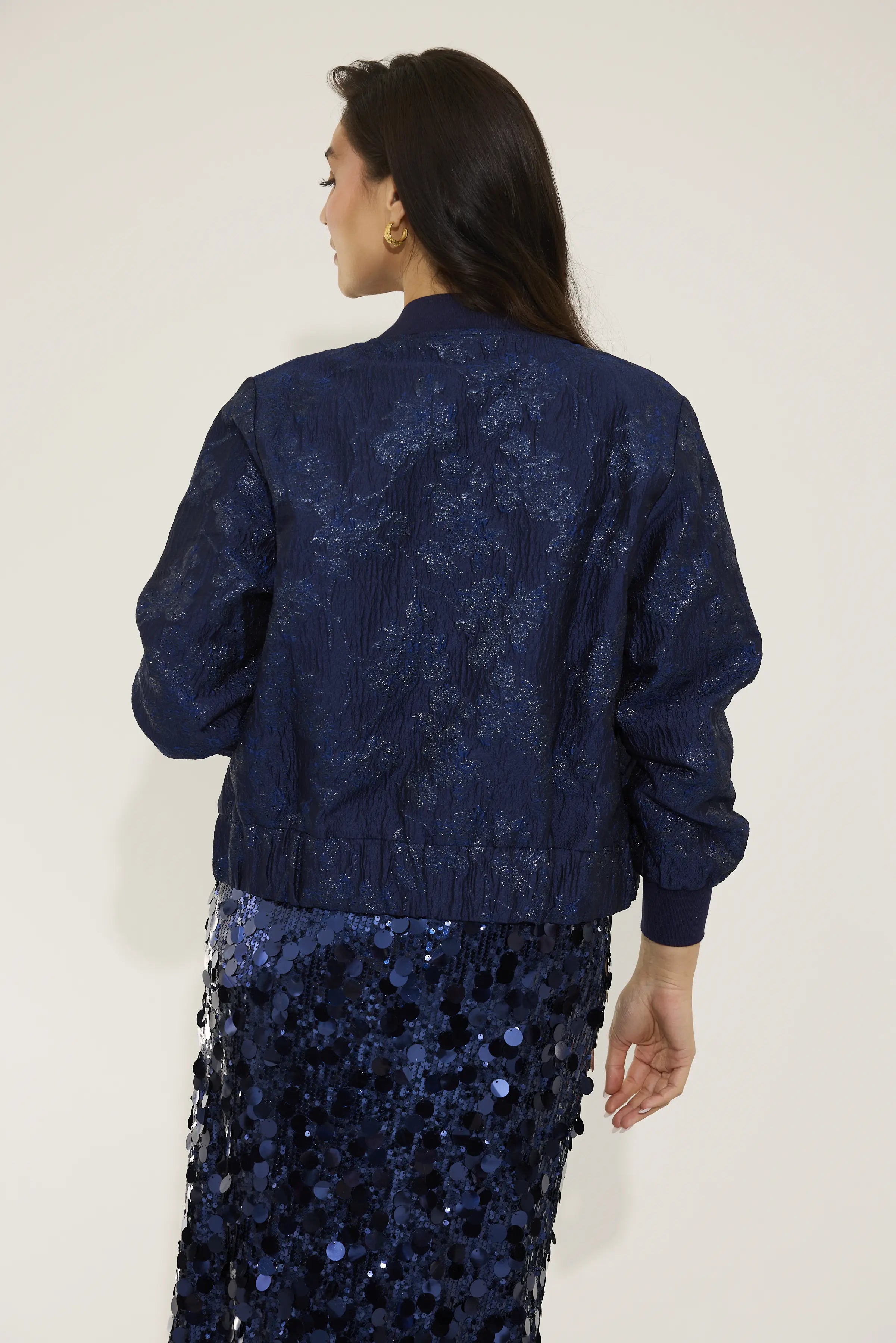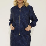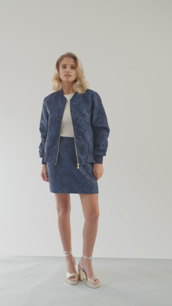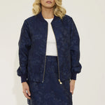 Crafted from exquisite navy jacquard woven with subtle metallic tones, Isla’s texture brings depth and quiet luxury. Finished with a navy ribbed collar and cuffs, our gold NOMI zip, and a bespoke printed lining, every element is intentional, refined, and meticulously crafted.